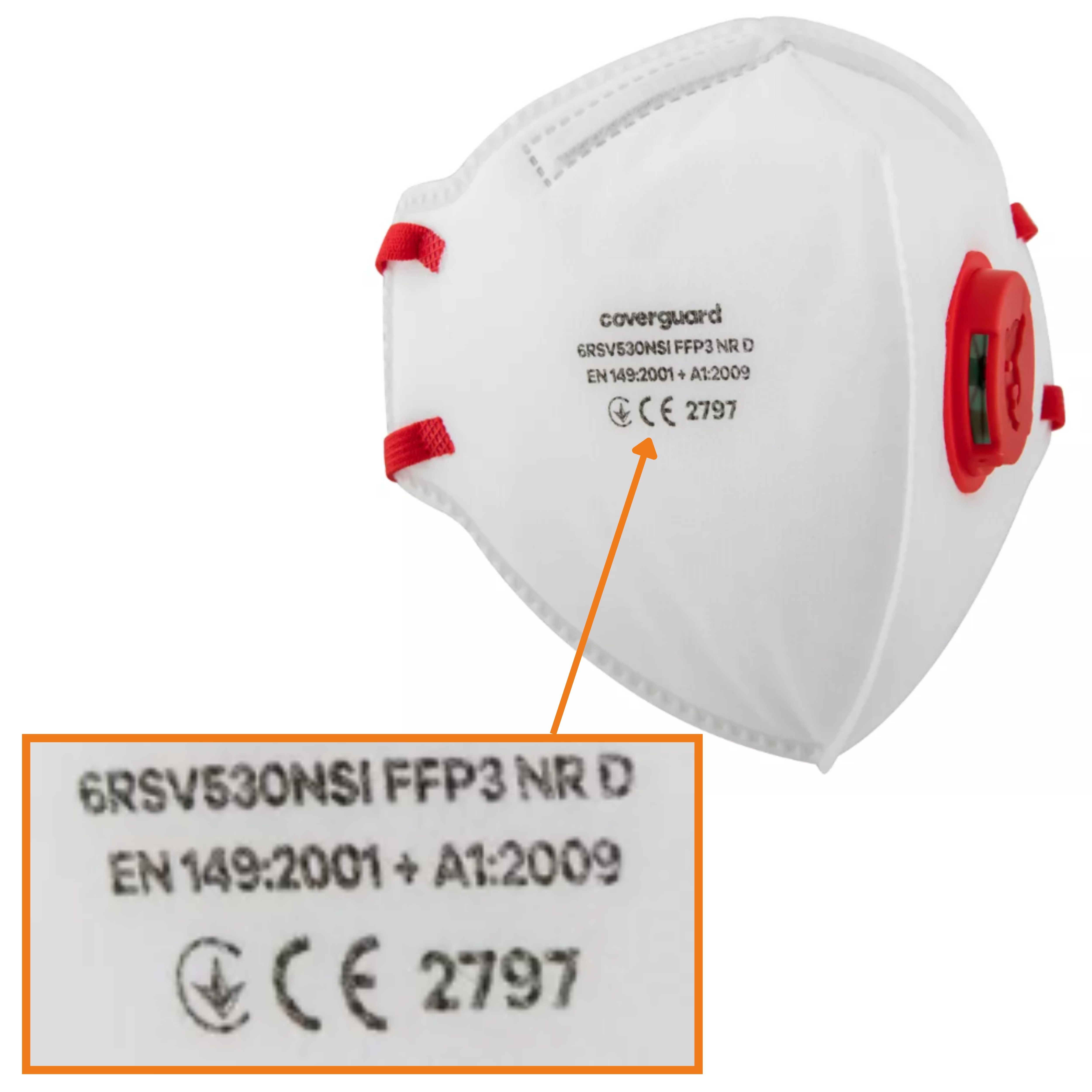 Un masque marqué « FFP3 NR D » sera utilisable pour un filtrage de niveau P3 sur une journée de travail (NR), sans colmatage prématuré (D). Le marquage CE avec le numéro de l'organisme notifié et la référence à la norme EN 149:2009 doit impérativement figurer sur chaque masque. |