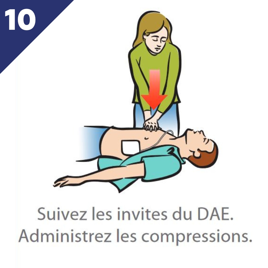 ![]() | - Mention « choc conseillé » : ne pas toucher le patient - Défibrillateur automatique : « le choc sera administré dans 3,2,1 » « le dae délivre automatiquement le choc de défibrillateur » - Défibrillateur semi-automatique : Lorsque le dae est prêt à administrer un choc de défibrillation, le bouton de choc clignote ». Appuyer sur le bouton rouge clignotant pour administrer le choc - « Choc administré » : vous pouvez toucher le patient. |